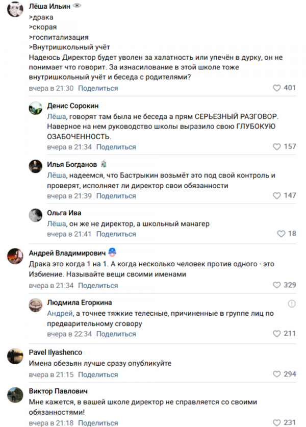 Отмечается, что в результате встречи с родителями учеников школы, то есть после их импровизированного митинга, Департамент образования и науки Москвы уволил Ланщикова с занимаемой должности. Перед своим увольнением он успел подписать документы об отчислении двух хулиганов. Но произошло это уже после общественного резонанса и реакции Следственного комитета, по инициативе Александра Бастрыкина возбудившего на драчунов уголовное дело по статье о хулиганстве. Сейчас оба задержаны. "Школа №2120 инициировала проведение внеочередного заседания комиссии по делам несовершеннолетних, на котором было принято решение об исключении виновных в избиении восьмиклассника. Приказы об отчислении школьников уже подписаны директором школы", - рассказали в пресс-службе департамента образования и науки.Напомним, что инцидент с избиением восьмиклассника произошёл 21 апреля. Два девятиклассника Ильназ и Джамал во время перемены жестоко избили 14-летнего восьмиклассника Сергея (все имена изменены). 15-летним подросткам якобы не нравился внешний вид Сергея, которого называли неформалом. По словам учеников школы, Ильназ и Джамал не в первый раз придирались и избивали Сергея, а руководство школы закрывало глаза на агрессивную парочку.Добавим для объективности, что некоторые СМИ называют хулиганов мигрантами, но это не так. Оба являются гражданами России азербайджанского и осетинского происхождения.