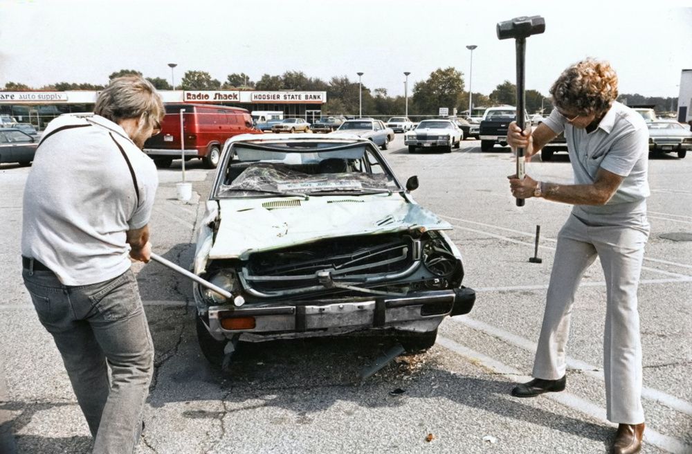 Благотворительный аттракцион, 1982 год. Целью мероприятия было сбор средств для семей, столкнувшихся с последствиями массовых "временных" увольнений в американском автопроме. За каждый удар по машине зрители платили по 1 доллару, что помогло привлечь внимание общественности к острым социальным вопросам того периода. В 1970-х и начале 1980-х годов американский автопром столкнулся с кризисом из-за растущей популярности японских автомобилей. Их успех объяснялся доступной ценой, экономичностью, надежностью и высоким качеством сборки, что особенно ценилось в условиях энергетического кризиса и роста цен на топливо. В то же время, американские производители, ориентированные на выпуск мощных, но прожорливых машин, оказались уязвимыми. Кризис привел к массовым увольнениям рабочих, протестам (включая символическое уничтожение японских авто) и требованиям ограничить импорт. В 1981 году США и Япония договорились о квотах на экспорт японских машин. Американские компании были вынуждены пересмотреть свою стратегию: они начали выпускать более экономичные модели и сотрудничать с японскими брендами, которые стали открывать заводы в США. Этот кризис стал уроком для американской промышленности, подчеркнув важность адаптации к рыночным изменениям и запросам потребителей.