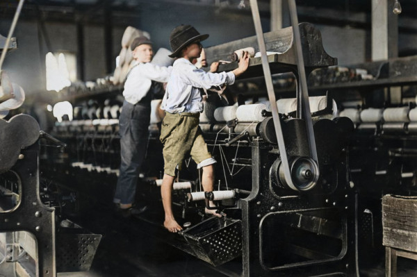 Два мальчика ремонтируют станок или заправляют оборванные нити. Джорджия, США, 1909 год. Многие семьи жили в бедности, особенно в сельской местности или среди рабочего класса. Доходы одного родителя (чаще всего отца) были недостаточны для обеспечения семьи, поэтому дети вынуждены были работать, чтобы помочь свести концы с концами. Дети часто трудились на фабриках, шахтах, фермах или в качестве разносчиков газет, подмастерьев и помощников.