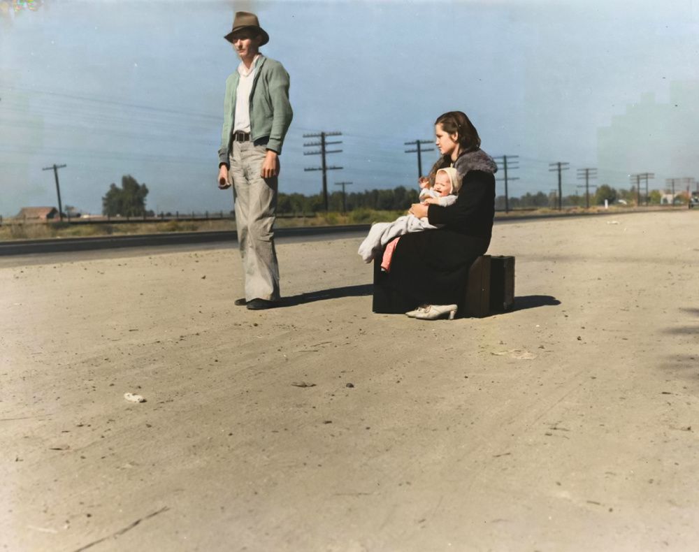 Молодая семья, без гроша в кармане, путешествует автостопом по шоссе US 99, Калифорния. В начале 1935 года двадцатичетырехлетний отец и семнадцатилетняя мать прибыли в Калифорнию из Уинстон-Сейлема, штат Северная Каролина. Их ребенок появился на свет в долине Империал, где супруги зарабатывали на жизнь, работая полевыми рабочими.