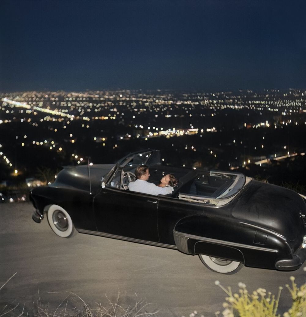 Пара обнимается в кабриолете с видом на Лос-Анджелес. Калифорния, Голливуд. США, 1951 год.