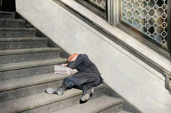 Юный разносчик газет спит прямо на работе. США, 1912 год.