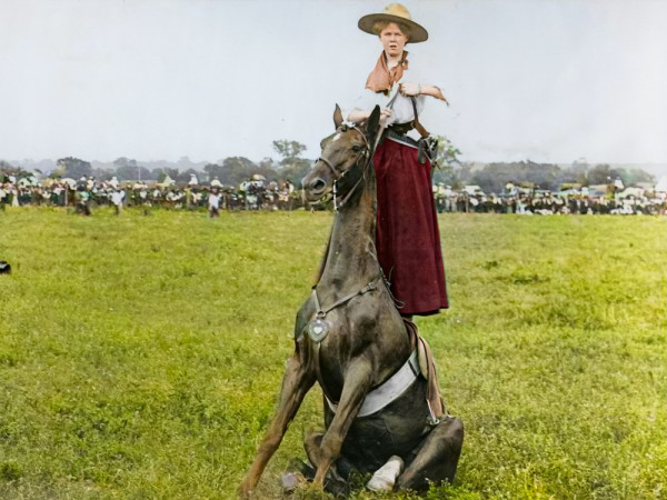 Люсиль Маллхолл на ранчо в штате Оклахома, 1909 год. Родившаяся и выросшая на ранчо в Оклахоме, Люсиль Маллхолл вошла в историю как одна из первопроходцев среди женщин, осмелившихся соревноваться с мужчинами в искусстве верховой езды. Она завоевала множество почётных титулов, включая "Королева Родео" и "Королева Западных Прерий". Свой профессиональный путь она начала в родео-шоу своего отца, "Маллхолл Дикого Запада", в 1899 году. Впоследствии Люсиль не только участвовала в различных родео-шоу, но и в 1916 году создала своё собственное. За выдающиеся достижения она была включена в Национальный музей ковбоев и западного наследия, Зал славы родео и Национальный музей и Зал славы пастушек, утвердив свой статус легенды американского Запада.