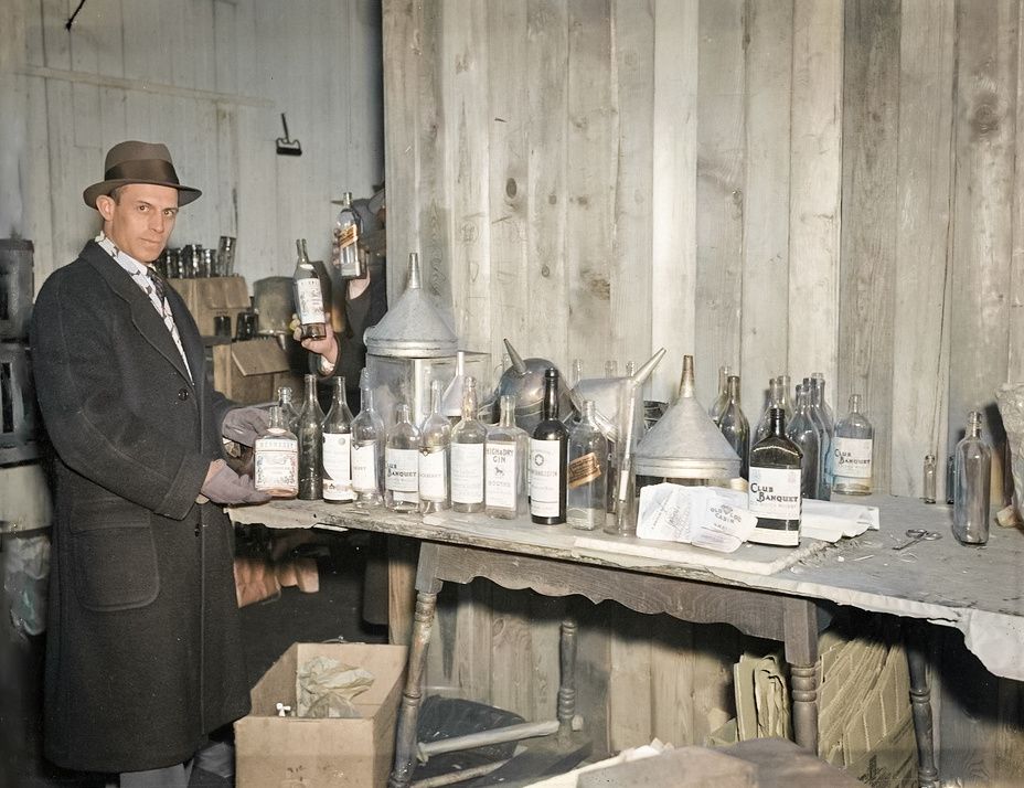 Подпольная "алкогольная фабрика". США, 1930-е. Яркий пример того, как в США во времена "сухого закона" (1920-1933) процветала нелегальная индустрия производства и продажи алкоголя. Несмотря на запрет, потребление алкоголя оставалось популярным. Многие граждане не желали отказываться от употребления спиртного, что создало огромный рынок для нелегального производства. Производство и продажа алкоголя стали крайне прибыльными занятиями. Подпольные фабрики могли работать с минимальными затратами, а алкоголь продавался по завышенным ценам через нелегальные каналы.