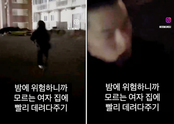 Видео под названием "Выбор случайной женщины и помощь ей в безопасном возвращении домой" показывало, как женщина убегает от "помощника" в явном страхе, не оглядываясь. Когда оно стало вирусным, внезапно оказалось, что таких роликов в сети довольно много. Студенты из Национального университета Чунгбук и Национального университета Ханбат также опубликовали видео с похожими подписями на прошлой неделе. Там несколько студентов сняли, как преследовали студентку по пустой улице ночью.