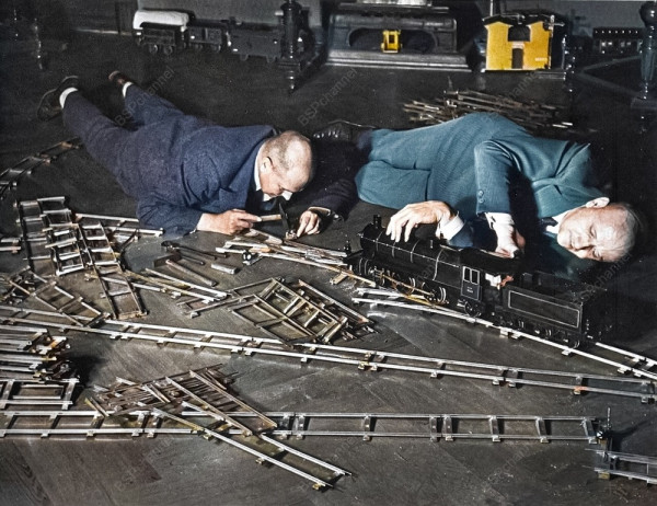 Два пожилых мужчины на полу в здании Общества игрушечных железных дорог. Один регулирует розетку небольшим молоточком, второй ремонтирует двигатель паровоза. Берлин, Германия, 1931 год.