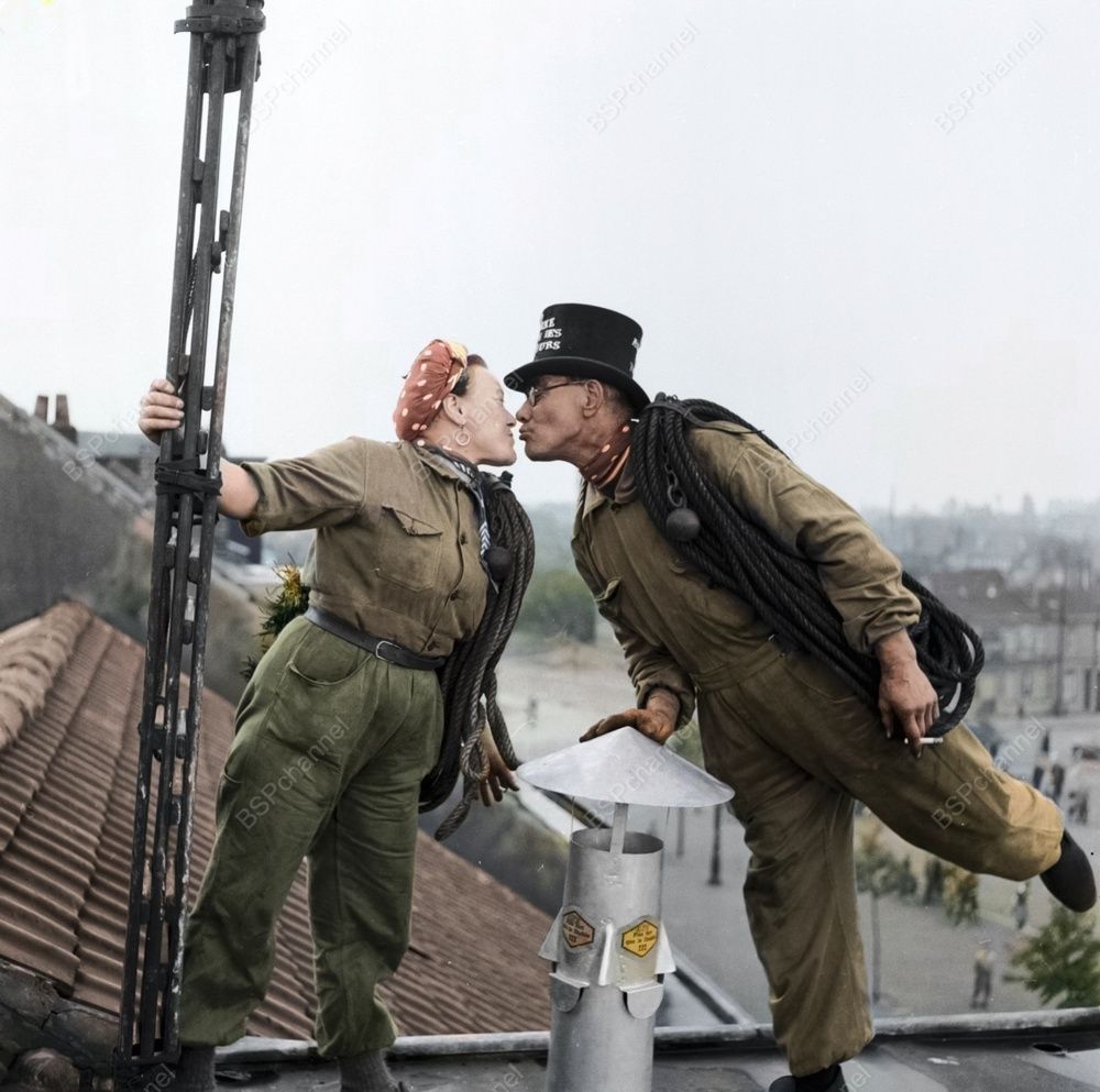 Из источника: Антуан Бехильс (63 года) из Волюве-Сен-Пьера, Брюссель, и его жена Мари целуются на крыше, пока чистят дымоходы. "Она фантастическая женщина, - говорит Антуан. - Она знает, как сделать мужчину счастливым, и у неё есть всё необходимое для этого"