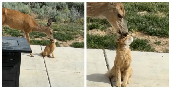 Очевидец запечатлел оленя, подружившегося с рыжим котом. Дикое животное подарило пушистому порцию нежностей.