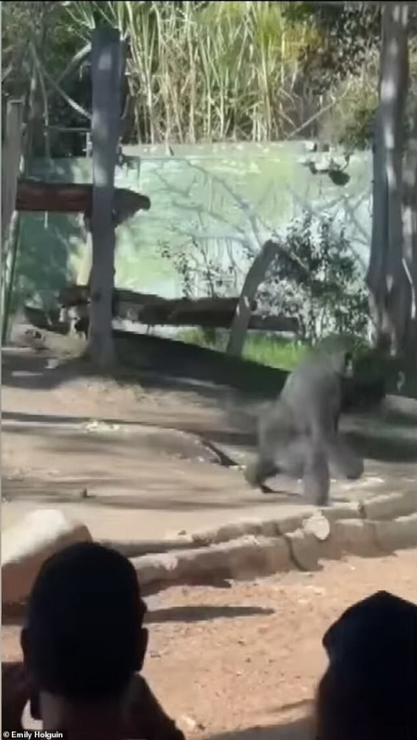 В субботу днём горилла Денни весом в 180 кг разбила секцию закалённого стекла. Примат бросился к барьеру, напугав семьи с детьми."Это было как землетрясение, мы не сразу поняли, что он ударился о стекло", - поделилась свидетельница Джеки Даблер в интервью 10News."Очень страшно. Но охранники действовали быстро. Сотрудники зоопарка отлично справились".На видео слышно, как посетители ахнули, когда стекло разлетелось от удара.Некоторые бросились прочь, другие подошли ближе, чтобы увидеть ущерб своими глазами."Если бы он снова ударил по стеклу, это была бы совсем другая ситуация", - добавил Даблер.Представители зоопарка Сан-Диего позже подтвердили, что животное не пострадало.