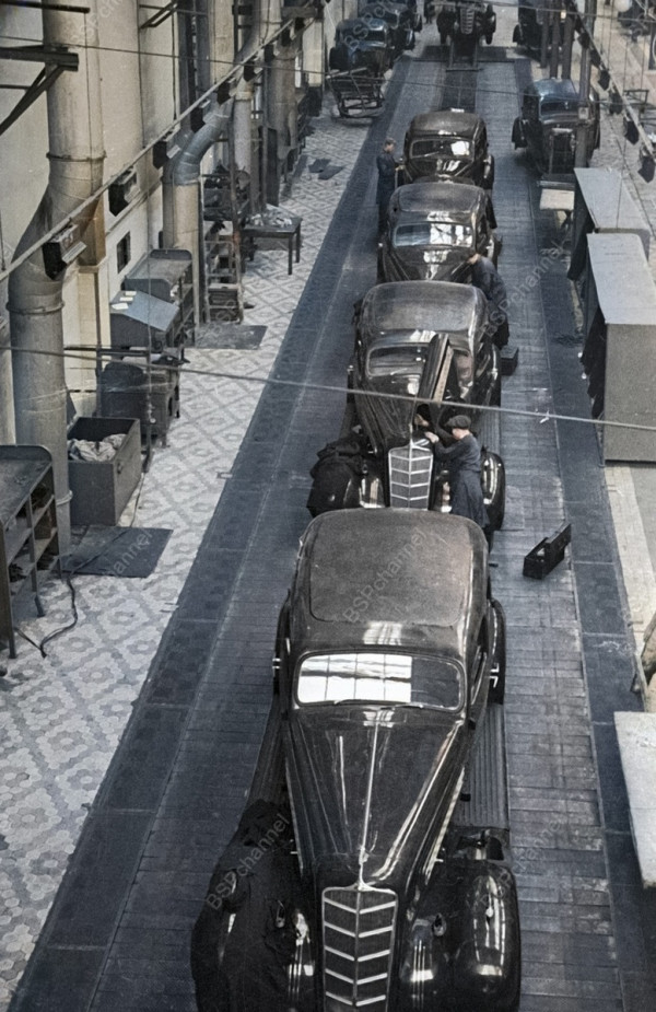 Первый конвейер легковых автомашин ЗИС-101 на заводе им. Сталина. Москва, 1938 год.