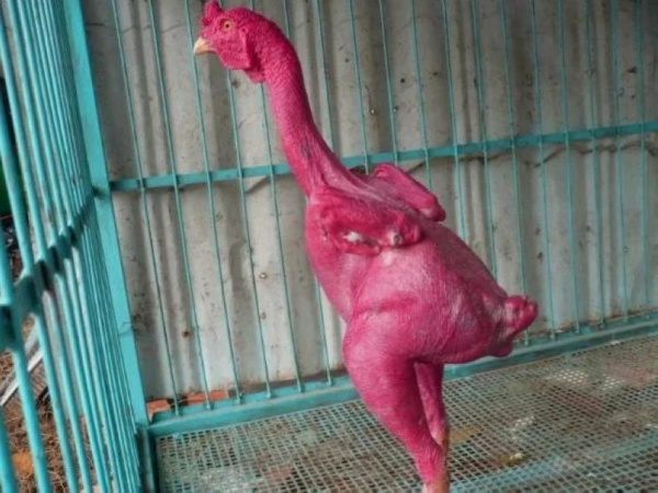 Второй ген полной бесшерстности (sc/sc). Его обнаружили среди мелких куриц яичного направления. Он не просто уменьшает количество перьев, а полностью отключает их рост. Кроме того, у птиц исчезают чешуйки на лапах и шпоры. Что из этого вышло? Смотрите на фото!