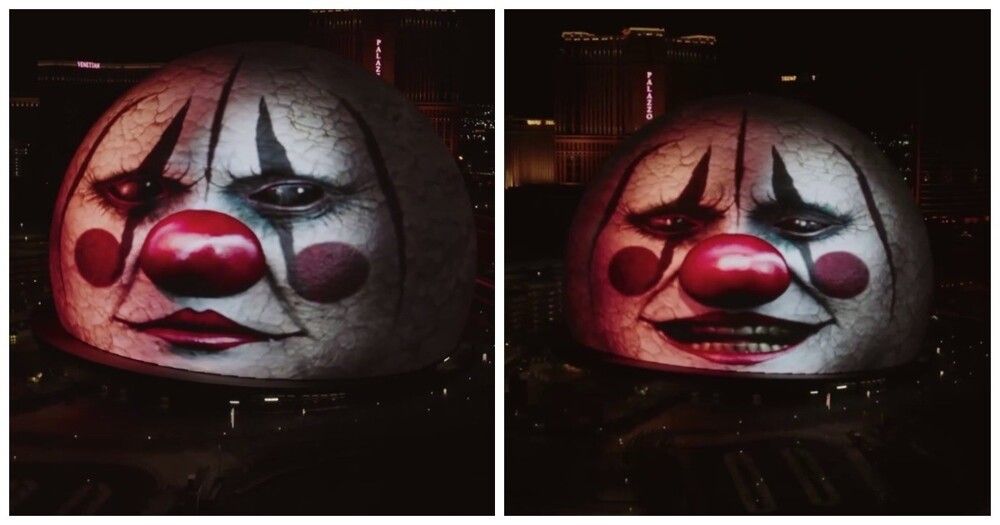 На высокотехнологичной сфере в Лас-Вегасе недавно разместили огромное лицо клоуна в честь грядущего Хэллоуина. Пугающего лицо с потрескавшимся гримом и пустыми глазами осматривает окрестности.