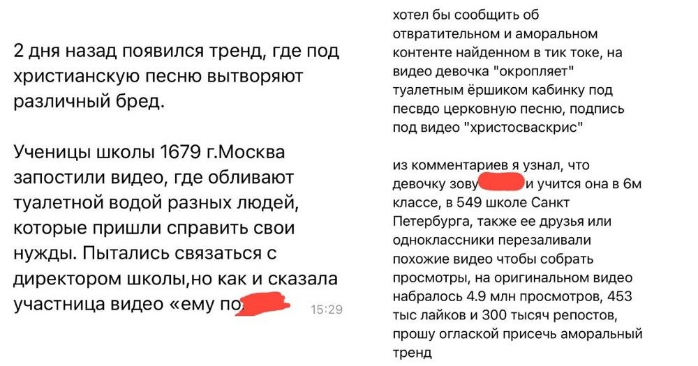 В начале нынешней недели некие активисты пожаловались главе Лиги безопасного интернета Екатерине Мизулиной на новый оскорбительный тренд школьников. Они записывают для "ТикТока" ролики, в которых под православное песнопение "окропляют" сверстников водой из унитаза при помощи ёршиков. Активисты попросили Мизулину придать инциденты огласке и привлечь виновных к ответственности по статье об оскорблении чувств верующих. Также они предоставили видео из школы № 1679 в Москве и № 549 в Санкт-Петербурге, назвав фамилии учеников, записывавших видео. "Это, конечно, самое настоящее оскорбление чувств верующих, за которое предусмотрена ответственность. Видео снимают в основном ученики 5-6 классов. В школах уже начались скандалы и конфликты из-за этого тренда.