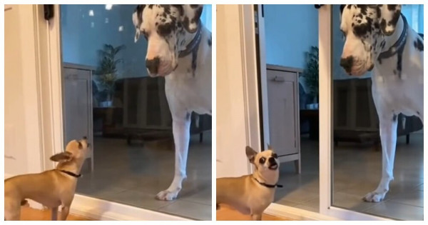 Маленькая собачка громко лаяла на другую собаку через стеклянную дверь... но как только дверь открылась, её уверенность испарилась!