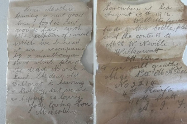 Послание в бутылке, найденной во время уборки пляжа в Австралии, оказалось письмами двух солдат Первой мировой войны, выпустивших ее 109 лет назад.