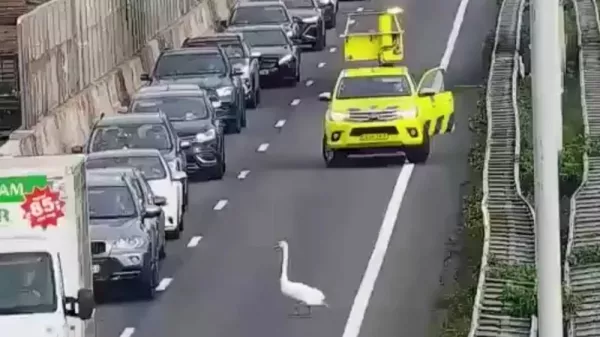 На трассе возле Горинхема движение неожиданно остановилось - лебедь решил неспешно перейти дорогу прямо перед машинами. Водителям пришлось притормозить и подождать, пока величественная птица в царственном темпе освободит полосу движения.