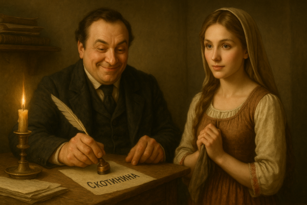 Подарок от чиновника: фамилия с насмешкойЕщё один способ получить странную фамилию - попасться на глаза чиновнику с "чувством юмора".Особенно жёстко доставалось крестьянам после восстаний: например, после Пугачёвского бунта родственников бунтовщиков переименовали в Дураковых по приказу Екатерины II. А некоторые фамилии - просто месть или издёвка помещика. Не заплатил оброк? Получай фамилию Скотинин.