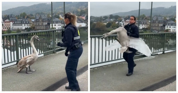 В интернете завирусилось видео, где лебедь почти выбежал на оживлённую дорогу, угрожая попасть под машину. Поймать грозного и шипящего животного удалось одной из полицейских, которая ловко справилась с задачей, обеспечив безопасность и птицы, и водителей.