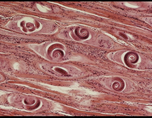 Молодняк проникает в кровеносные и лимфатические сосуды, а оттуда -в мышцы. То есть в мясо. Свернувшись улиткой, личинки создадут вокруг себя капсулу. Так организм хозяина перестанет реагировать на присутствие инородных гадов и выключит иммунный ответ. Но сами трихинеллы продолжают жить, мало-помалу вытягивая питательные вещества из соседних клеток. В таком виде они существуют, пока жив хозяин. А когда он "того", его закономерно кто-то съест, и паразиты замкнут порочный круг развития.