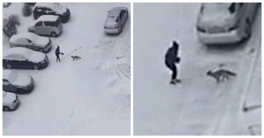 Лиса атаковала девушку во дворе жилого дома в Новосибирске. Житель одного из домов запечатлел, как хищница преследует девушку.