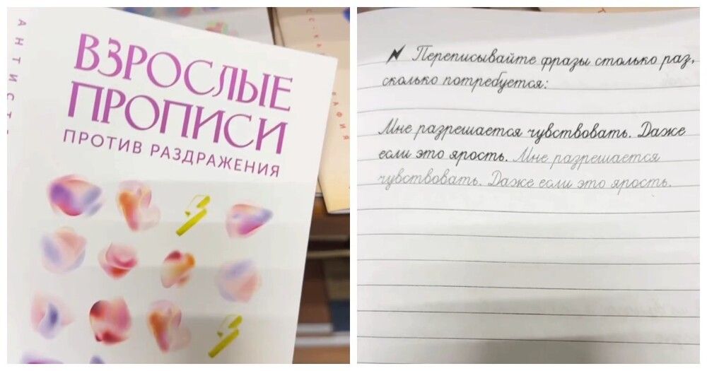 В российских магазинах начали продавать тетради для взрослых, созданные для борьбы со стрессом, тревогой и выгоранием. На каждой странице нужно несколько раз писать одну и ту же фразу, чтобы почувствовать спокойствие и внутреннюю перезагрузку.