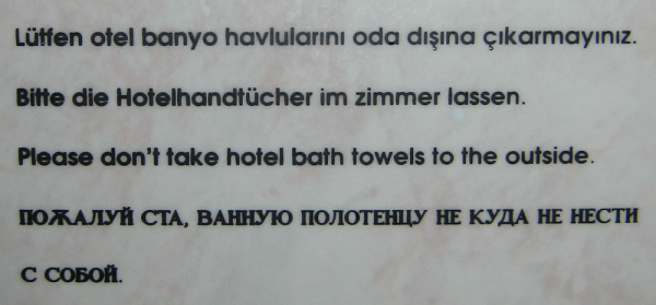 Как известно, очень много наших соотечественников посещают турецкие и прочие зарубежные курорты. Ну и дабы туристы лучше ориентировались, хозяева отелей и прочих турецких заведений вывешивают вывески и ценники на русском языке. Правда, порой там встречается столько ошибок, что выглядит все это очень смешно.