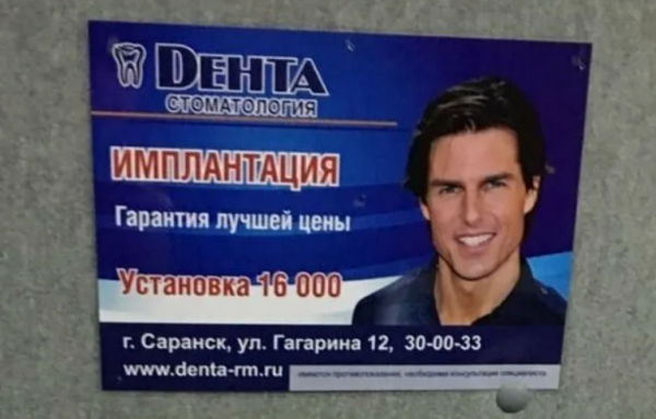 Но что делать, если не хочется тратить деньги на знаменитостей? Хитрые российские бизнесмены нашли выход. Они просто лепят на рекламу или вывески своих заведений известных зарубежных знаменитостей. Вряд ли условный Том Круз узнает, что он является лицом стоматологической клиники в Саранске.