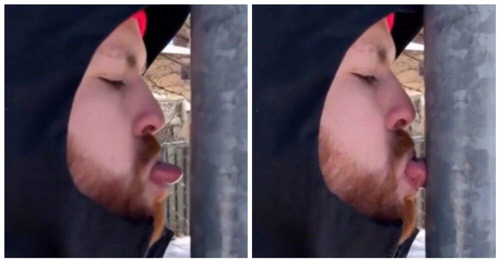 Многие в детстве не удерживались от соблазна лизнуть на морозе что-нибудь металлическое. Герой видео, похоже, решил вспомнить свои детские годы.