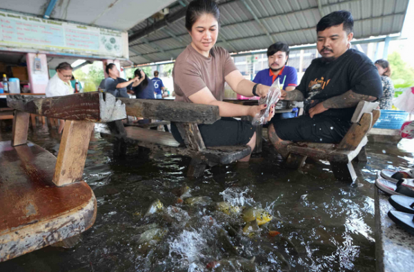 Дело в том, что ресторан под названием Pa Jit примерно в 30 км от Бангкока просто идеально затопило - вода остановилась где-то на уровне по колено. То есть можно сидеть на стуле в сухости, но опустить ноги в воду. А поскольку река стоит так уже 11 дней, сюда давно приплыли на кормежку разные рыбки! И посетители могут болтать ногами посреди стаи рыб или бросать им еду из своей тарелки. Это не покупные, а простые дикие рыбы, так что никто не будет винить тебя, что ты кидаешь им хлеб или острое мясо, как делают люди в платных ресторанах с рыбами.