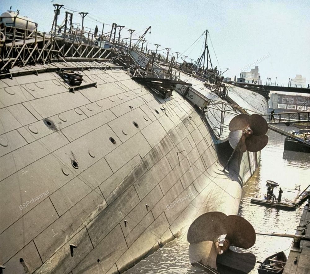 Французский трансатлантический лайнер Normandie с поднятыми из воды гребными винтами, 1942 год.