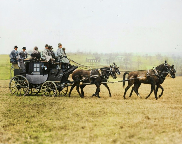 Девять человек в дилижансе, запряжённом четырьмя лошадьми. США, Вирджиния, 1926 год.