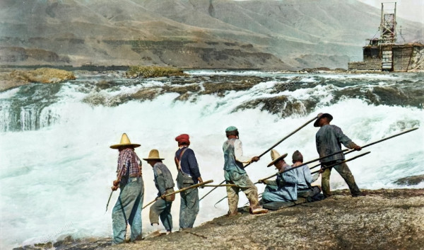 Рыбаки вооруженные копьями, ловят лосося у водопада Селило. Река Колумбия на границе штатов Орегон и Вашингтон, США, около 1920 года.