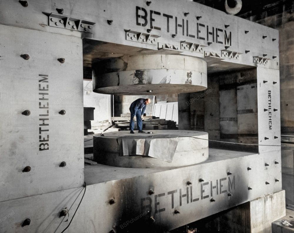 Осмотр оборудования для ковки большого магнита. Магнит использовался в циклотроне, 1948 год.