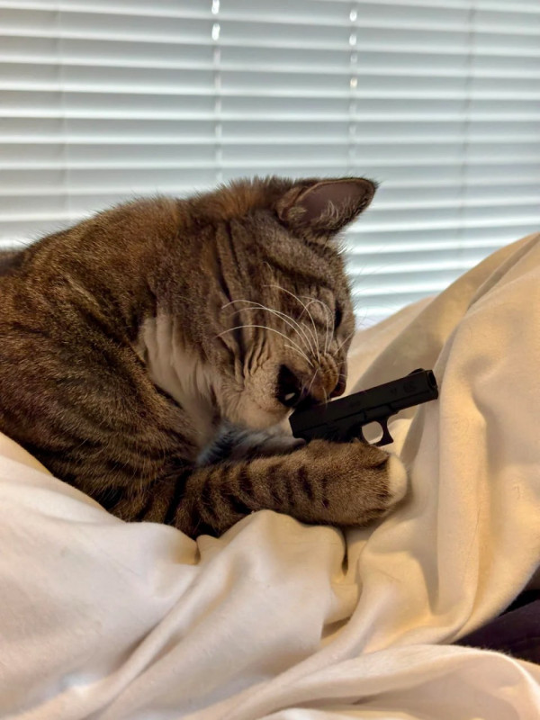 Коту приглянулась модель пистолета, напечатанная на 3D-принтере. Вооружён и очень опасен!
