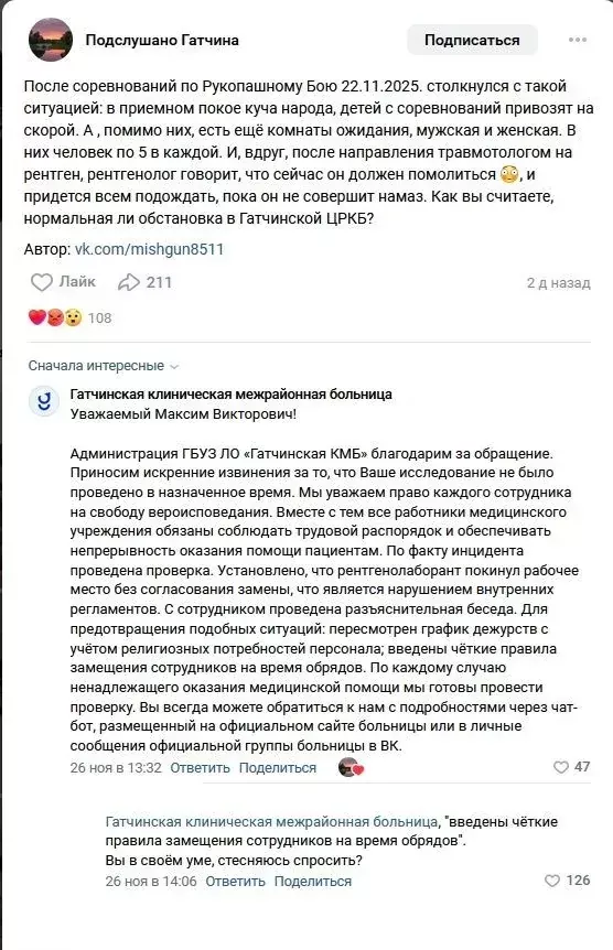 Это замечание вызвало закономерный общественный резонанс. Интернет-пользователи недоумевают, о каком компромиссе может идти речь в клиниках? Что, если понадобиться помолиться анестезиологу или хирургу во время проведения операции? Член СПЧ Марина Ахметова заметила, что осторожный тон духовных лидеров не поможет достучаться до радикальной паствы, а те, кто исповедует спокойный традиционный ислам, и так не нарушают правил. Важно, чтобы государственные органы правопорядка более решительно боролись с нарушителями и пресекали попытки совершить публичный намаз в общественных местах, не предназначенных для молитвы.