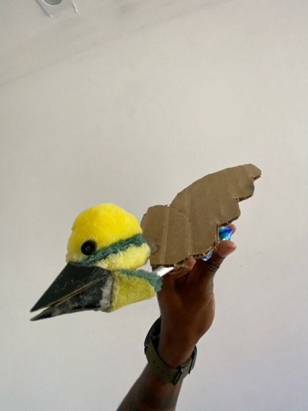 "Я вспомнил видео из ветеринарной клиники. Там кормили тукана с помощью искусственного клюва. Я позаимствовал идею. Из картона вырезал крылья, отрезал кусочки губки и склеил, добавил два маленьких чёрных глазка и приклеил картонный клюв. Когда я подошёл к птенцу, он сразу поднял голову, открыл клюв и начал "общаться" с "мамой". Отреагировал на призыв к кормлению".