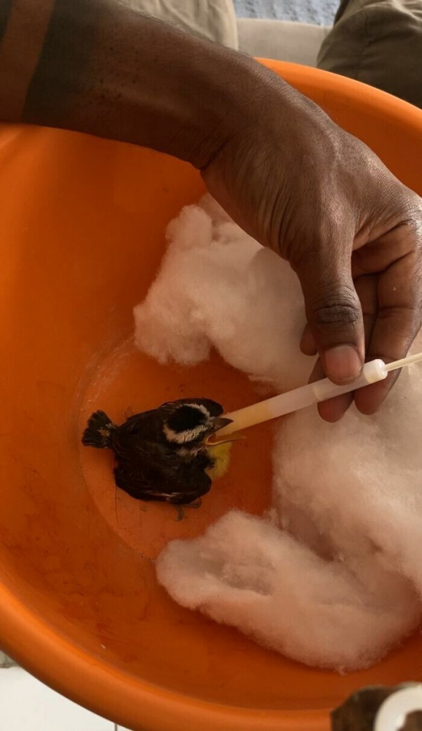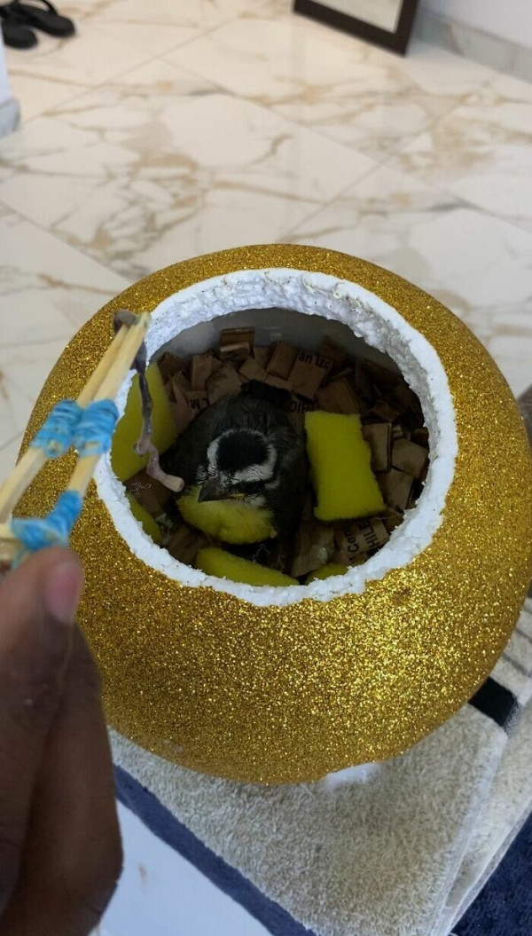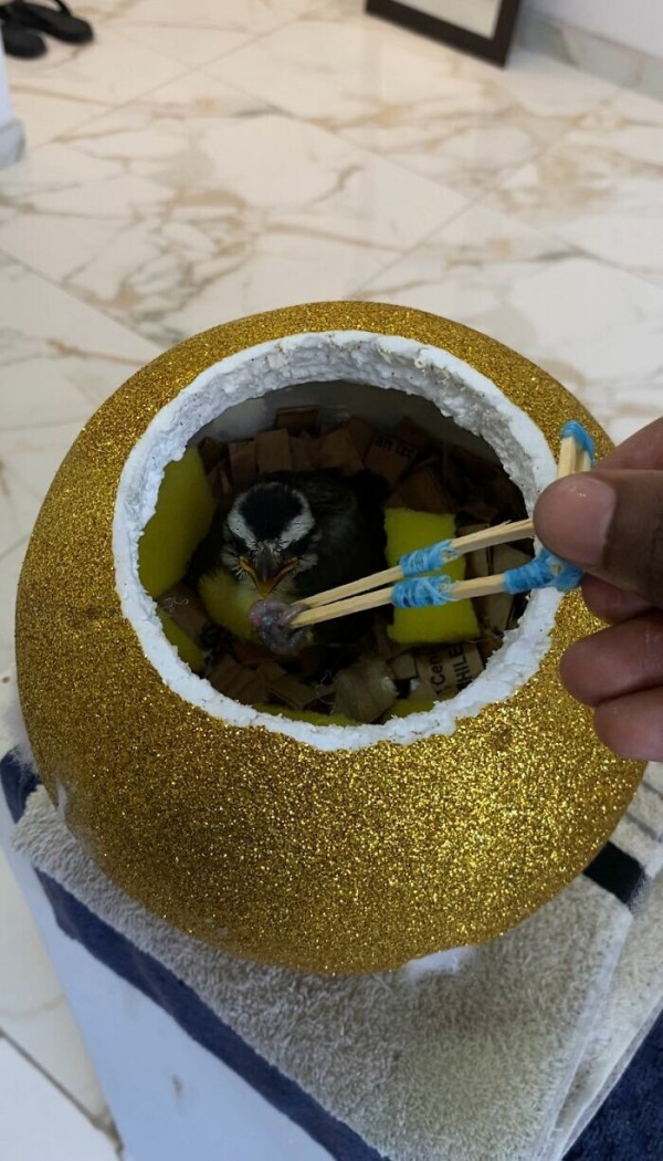 Бразилец соорудил для пернатого тёплое и безопасное гнездо, а также создал "маму" для кормления малыша. С помощью спичек, клея, губки, картона и зубной нити он изготовил маленькое устройство, имитирующее клюв птицы. И птенец сразу же поднял голову, открыл клюв и начал общаться с "мамой". Этот момент тронул сердца всех, кто увидел видео.