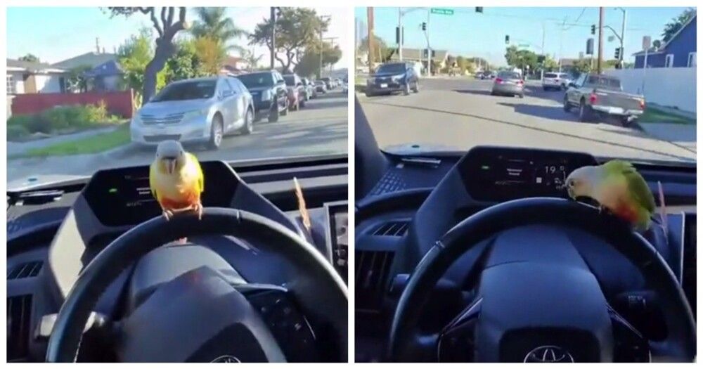 Попугай обожает совместные поездки с хозяином. Когда мужчина крутит руль, птица демонстрирует абсолютную невозмутимость и даже не пытается улететь.
