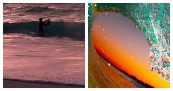 Мужчина сделал несколько эффектных снимков волн на фоне заката. Для этого ему пришлось зайти в океан и активно использовать вспышку.