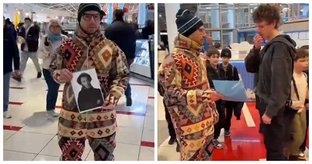Мужчина с портретом Пушкина прошёлся по ТЦ и спросил у молодёжи, что это за рэпер