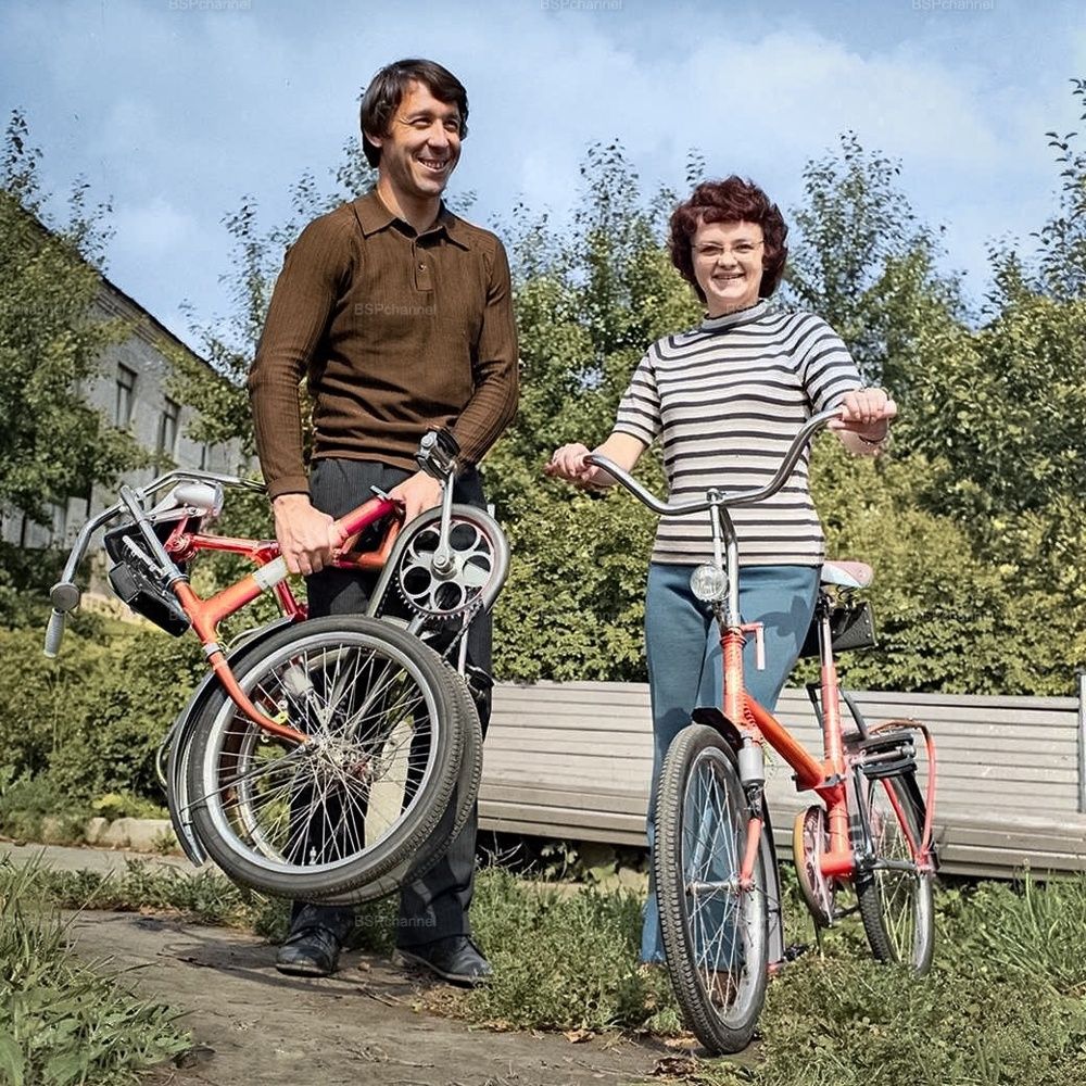 Конструкторы Пермского велосипедного завода Виктор Ощепков и Ольга Комарова с велосипедами "Кама". Пермь, 1973 год.