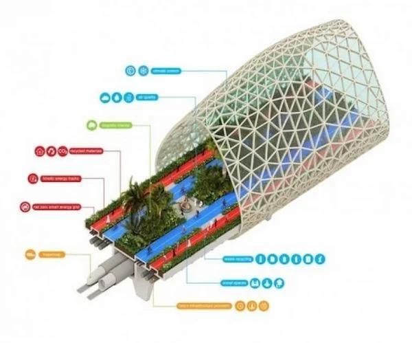Климат-контроль и "зеленые" технологииВся магистраль будет находиться под климат-контролем: внутри поддержат комфортную температуру и защиту от жары с помощью комбинации испарительного охлаждения и других инженерных решений. Энергоснабжение инфраструктуры планируют строить на 100% возобновляемых источниках, в том числе на кинетической энергии от шагов и поездок пользователей, а для полива зелени использовать только переработанную воду.