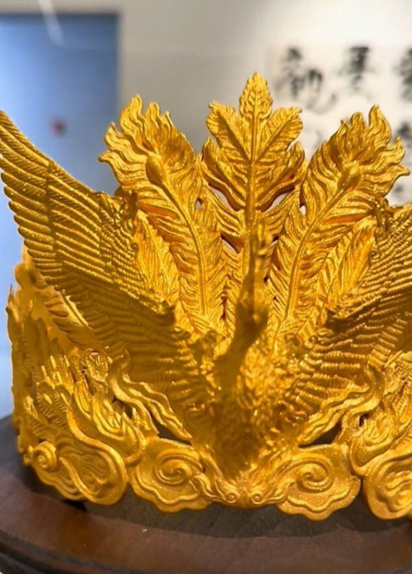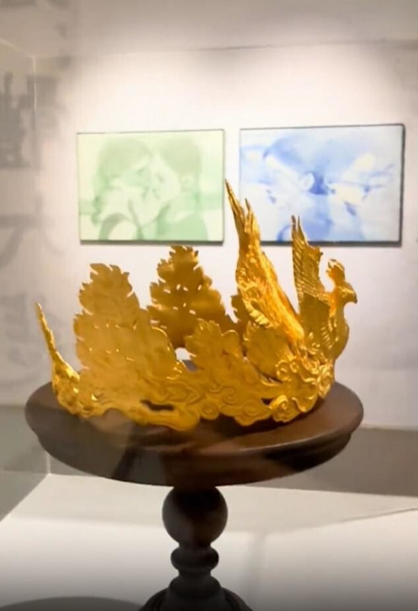Видео опубликовала китайский блогер Чжан Кайи, она и организовала выставку.Золотая корона - уникальное свадебное украшение, созданное мужем галеристки.