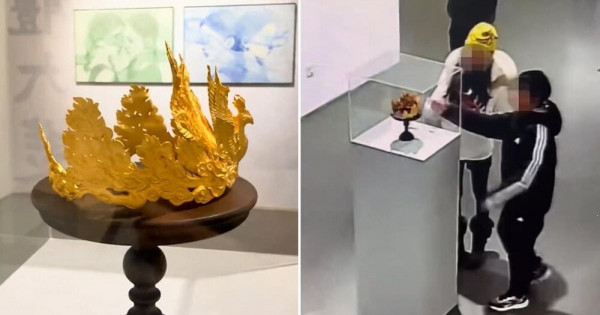 На выставке в Пекине произошёл неприятный инцидент. Юного посетителя привлекла золотая корона ручной работы, он потянул к ней руки и задел защитный куб. Драгоценный экспонат, стоимость которого оценивается в 25 миллионов рублей, упал на пол.