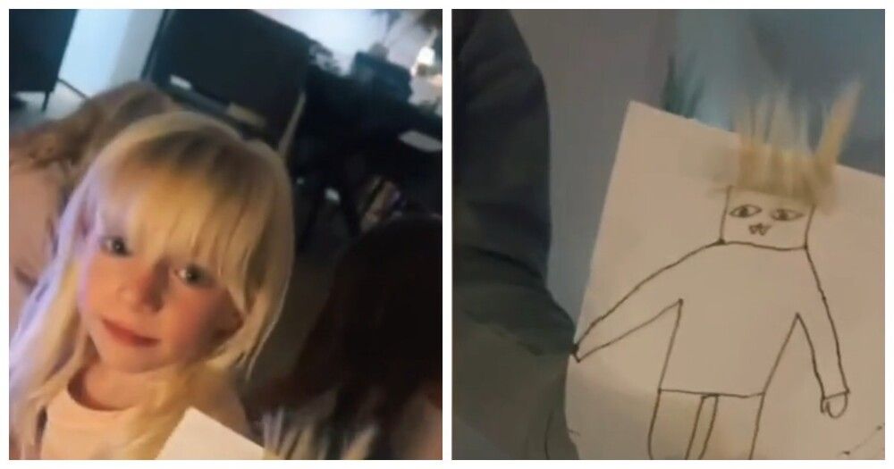 Девочка проявила необычную фантазию: она аккуратно отрезала локон волос и приклеила его к человечку на рисунке, создавая эффект настоящей причёски.