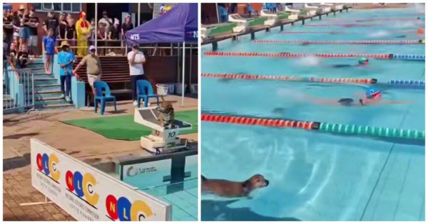 В Южной Африке пёс решил присоединиться к соревнованиям по плаванью в детской спортивной школе. Он прыгнул в воду и вместе с другими участниками доплыл до финиша.