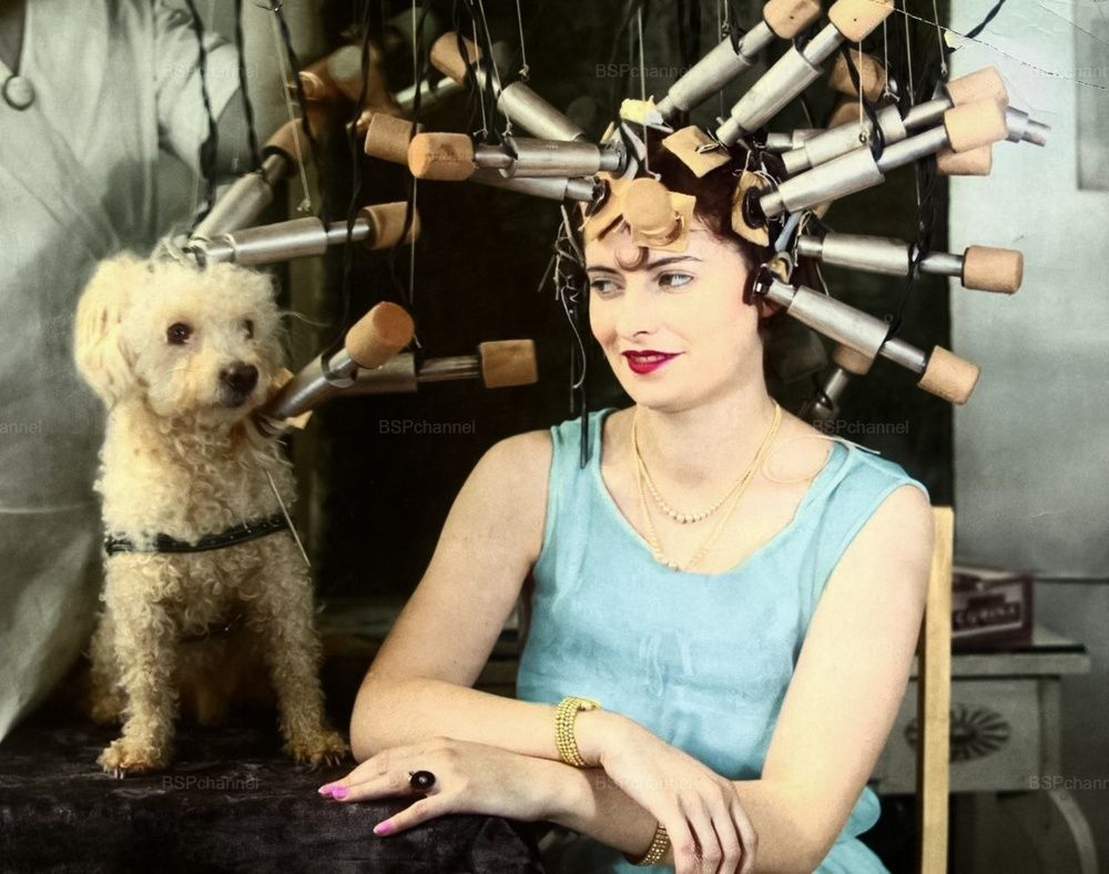 Женщина и ее пудель по кличке Баблз в школе красоты Мэрион в Нью-Йорке, 1920-е.