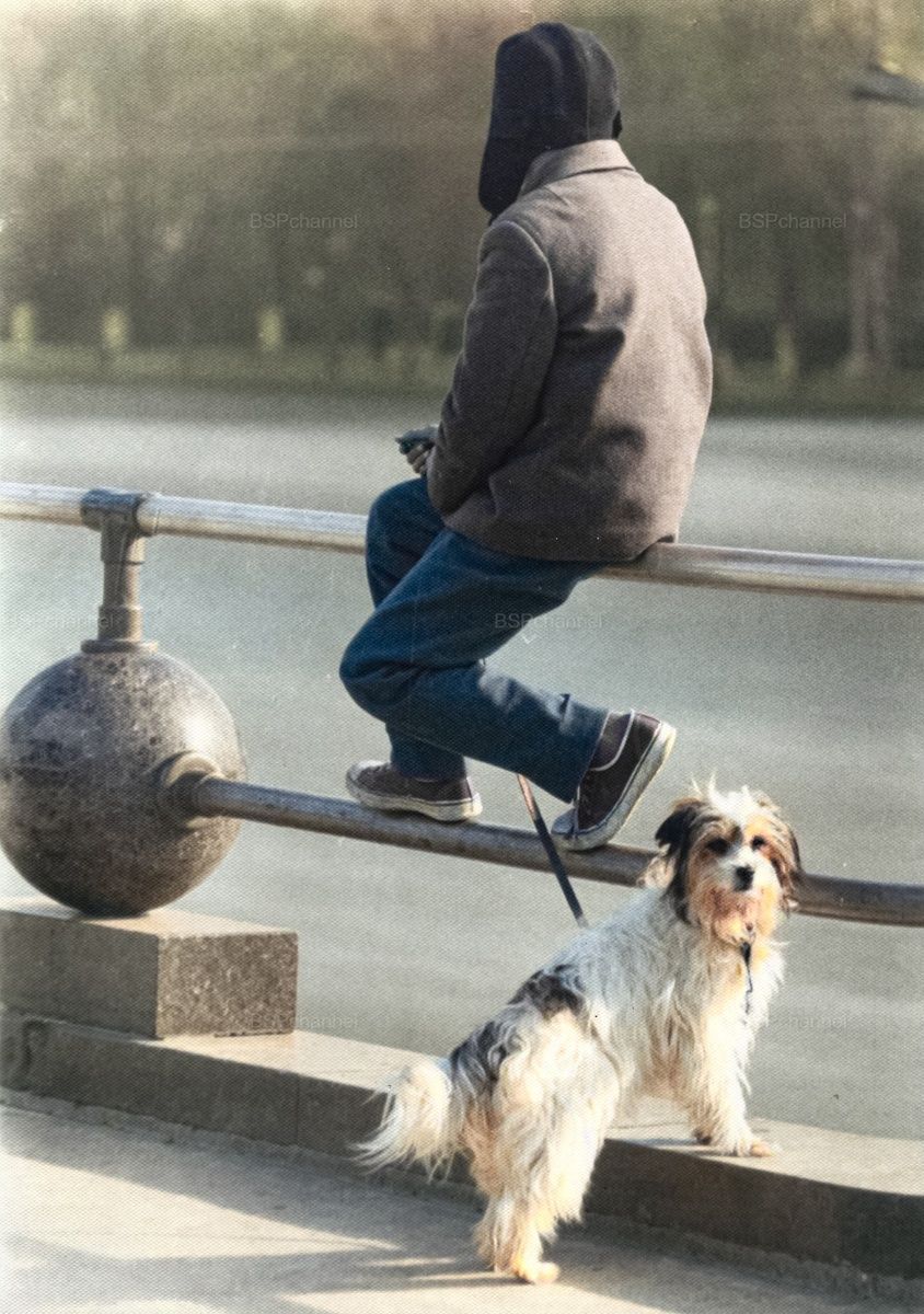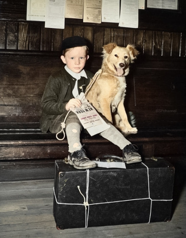 Мальчик сидит с собакой на железнодорожной станции, 1937 год.