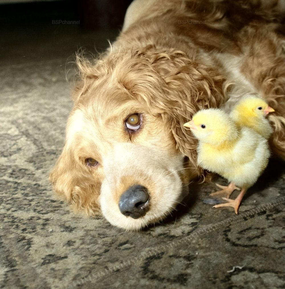 Десятилетний спаниель по кличке Труди лежит рядом с выводком птенцов, 1959 год.