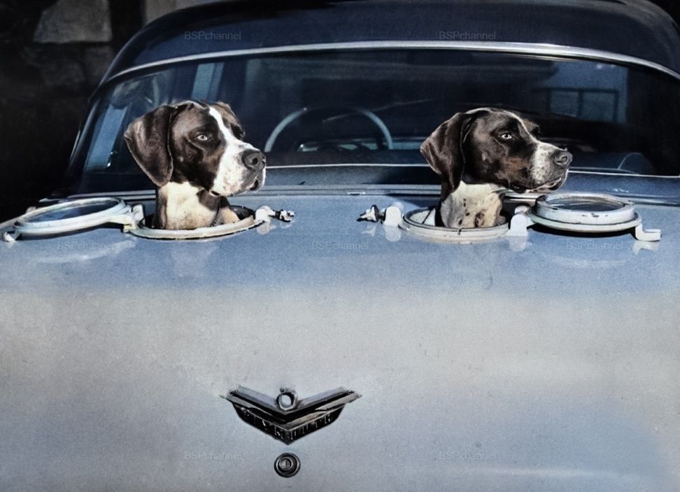 Два пойнтера выглядывают из багажника через специальные отверстия. США, 1958 год.